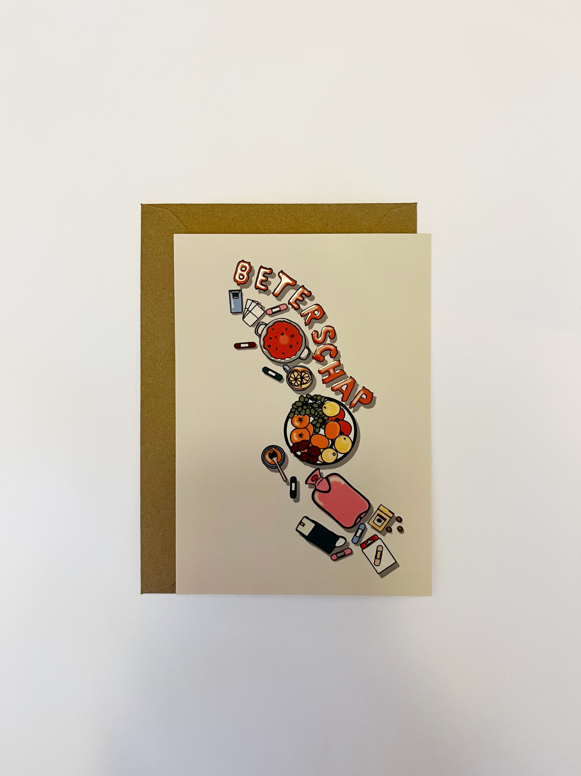 Beterschap! Deze kaart zit vol kleine, zorgzame illustraties en is perfect om iemand op te vrolijken tijdens het herstel. Een lief gebaar met een glimlach.